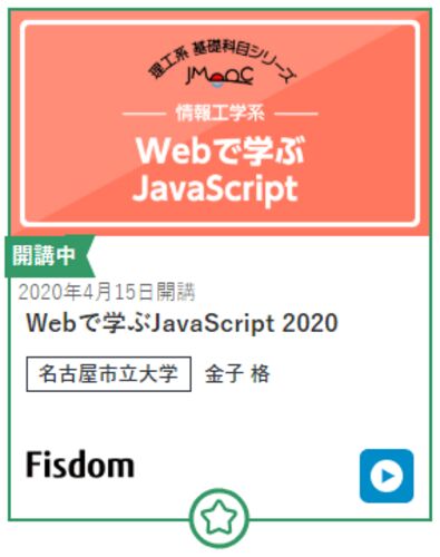無料で学べる「JMOOC」というオンライン講座があります。 JMOOCの中に、JavaScriptの講座もありました。 JMOOC https://www.jmooc.jp/ www.jmooc.jp ja.wikipedia.org 一般社団法人日本オープンオンライン教育推進協議会(Japan Massive Open Online Courses…